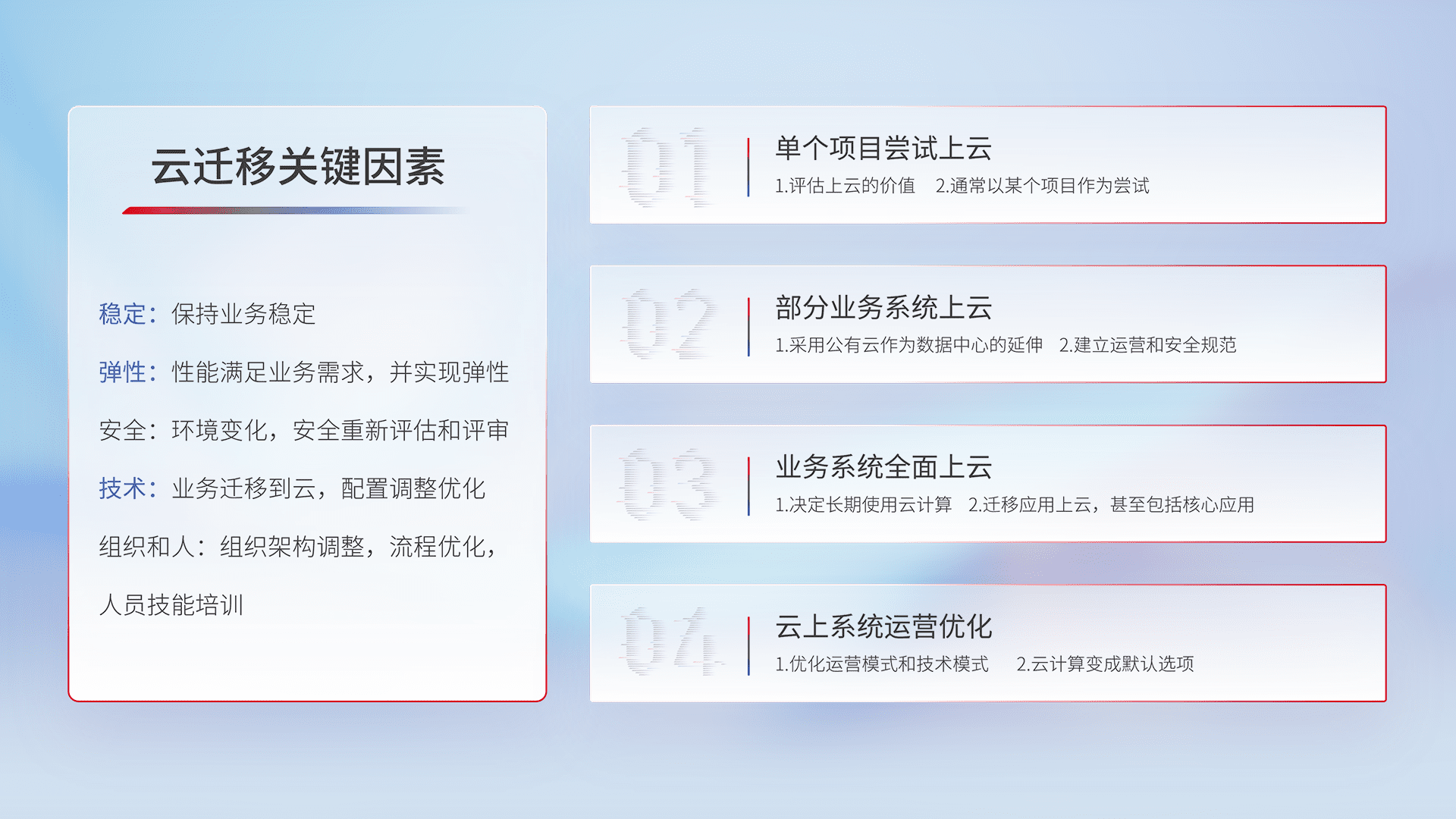 结合实际业务,,,从规划设计、、、、云平台选型、、、云原生改造、、、、数据迁移、、集成交付,,,迁移全过程为客户识别最佳上云路径,,,做好风险识别管理,,,设计网络架构、、、身份权限、、、、安全审计合规、、操作审计、、、、日志审计、、、监控告警策略、、多站点容灾设计等,,,,对云上基础设施进行整体规划,,提升IT治理水平,,,,以满足弹性、、高可用、、、高性能的需求。。。